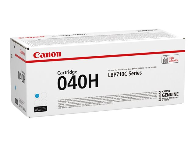 Description du produit Canon 040 H - haute capacité - cyan - original - cartouche de toner Type de Produit Cartouche de toner Technologie d'impression Laser Couleur d'impression Cyan Rendement de la cartouche Haute capacité Rendement Jusqu'à 10000 pages Compatible avec imageCLASS LBP712Cdn -